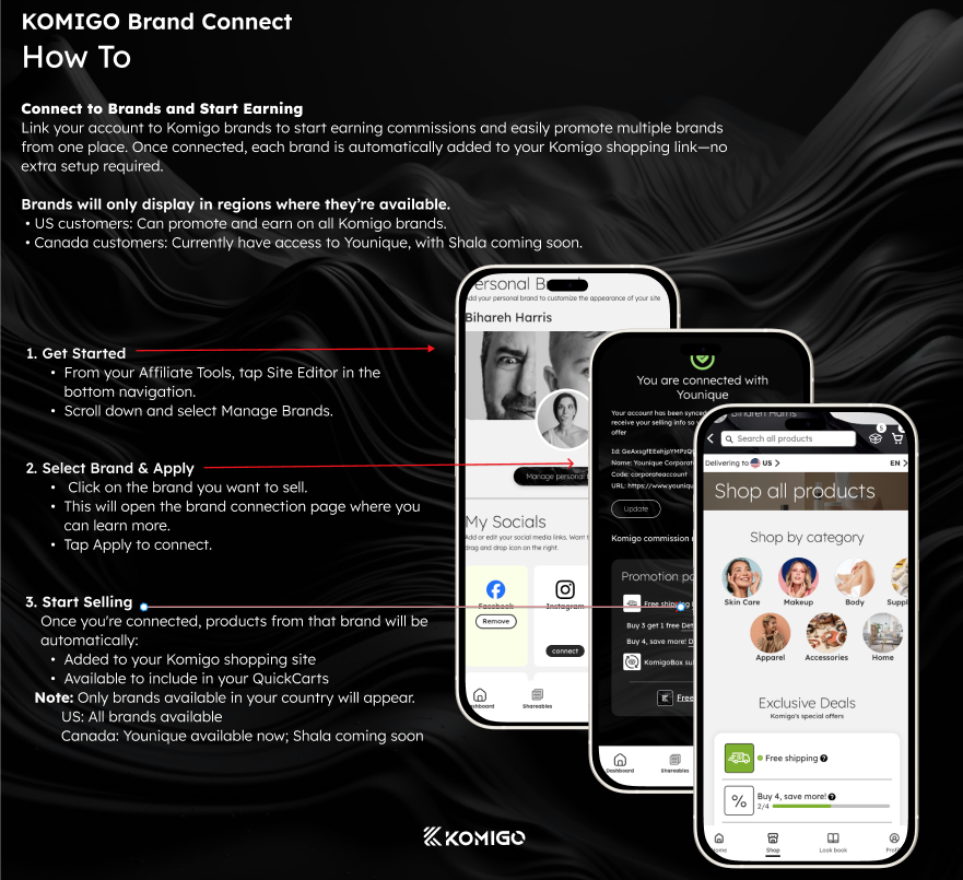 Link your account to Komigo brands to start earning commissions and easily promote multiple brands from one place. Once connected, each brand is automatically added to your Komigo shopping link—no extra setup required