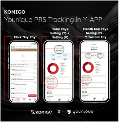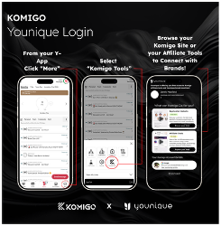 Younique se ha asociado con Komigo para ofrecer a las embajadoras de marca y afiliadas de marca de Younique en EE.UU., Canadá, Australia, Nueva Zelanda, Reino Unido, México, Alemania, Francia, España, Italia, Irlanda, Portugal, Bélgica, Austria, Países Bajos, Polonia, Dinamarca y Luxemburgo una herramienta de venta social gratuita.